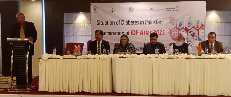Islamabad, (Parliament Times) : Diabetes in Pakistan is increasing at an alarming rate. Pakistan has 3rd highest burden of people living with diabetes and the rate in which diabetes is increasing Pakistan is world number 1 country with fastest growth of diabetes. In just two years no. of people living with diabetes has increased from 19.4 million to 33 million. If no urgent policy action taken, number of people living with diabetes will increase to 62 million by 2045. Sugary drinks are major contributors to diabetes. Government shall take immediate policy actions to reduce their consumption. This was stated by health, policy and economic experts and parliamentarians in “Dissemination of International Diabetic Federation Atlas 2021” organized by Pakistan National Heart Association (PANAH) at a local hotel in Islamabad. Event was attended by Parliamentarians, health professionals, government representatives, civil society and media. The event was hosted by PANAH’s General Secretary Sanaullah Ghumman. The guests included Professor Dr. Basit Ali, Secretary General diabetic association of Pakistan, Dr. Qaiser Sajjad, President, Pakistan medical association, Major. Gen. (R) Masud ur Rehman Kiani, President PANAH, Mr. Munawar Hussain, consultant at Global Health Advocacy Incubator, , Uzma Jadoon, MNA,Dr. Shehzad Ali Khan, VC, health services academy, Col. Dr. Shakeel Ahmed Mirza, Dr. Mazhar Qayyum, Eye specialist, Dr. Baseer Achakzai, Ms. Sarwat Tahira Habib, advisor sales tax and excise FTO, Senator Sardar Shafique civil society representatives, health professionals and media. Dr. Shazia Aslam Soomro was the chief guest of the occasion.