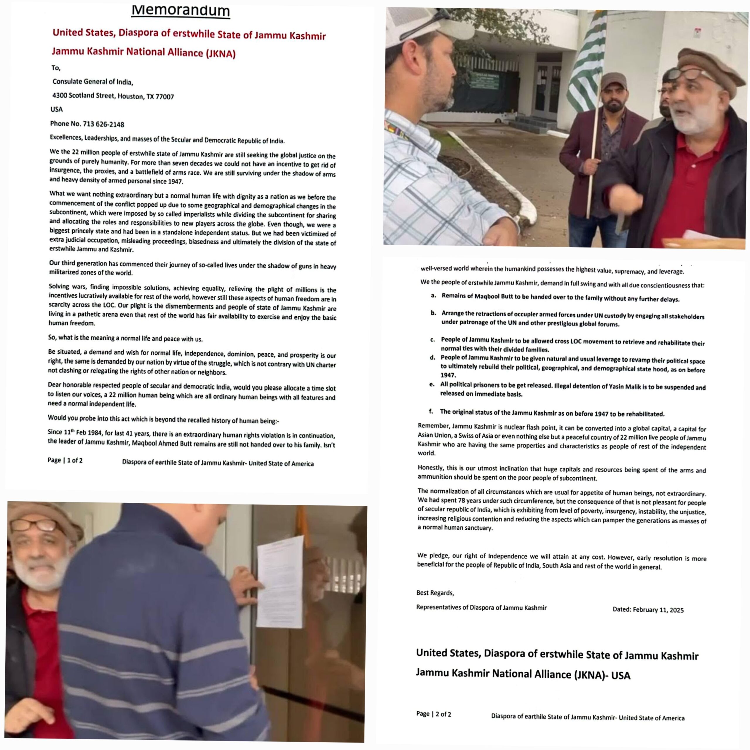 Houston, Texas (Press Release) – On the 41st death anniversary of Kashmiri martyr Muhammad Maqbool Butt, a protest demonstration was held in front of the Indian Consulate in Houston, Texas, by the Kashmiri diaspora. The demonstration condemned Indian atrocities in occupied Kashmir, demanded the return of Maqbool Butt’s mortal remains, and called for the release of Chairman JKLF Muhammad Yasin Malik.