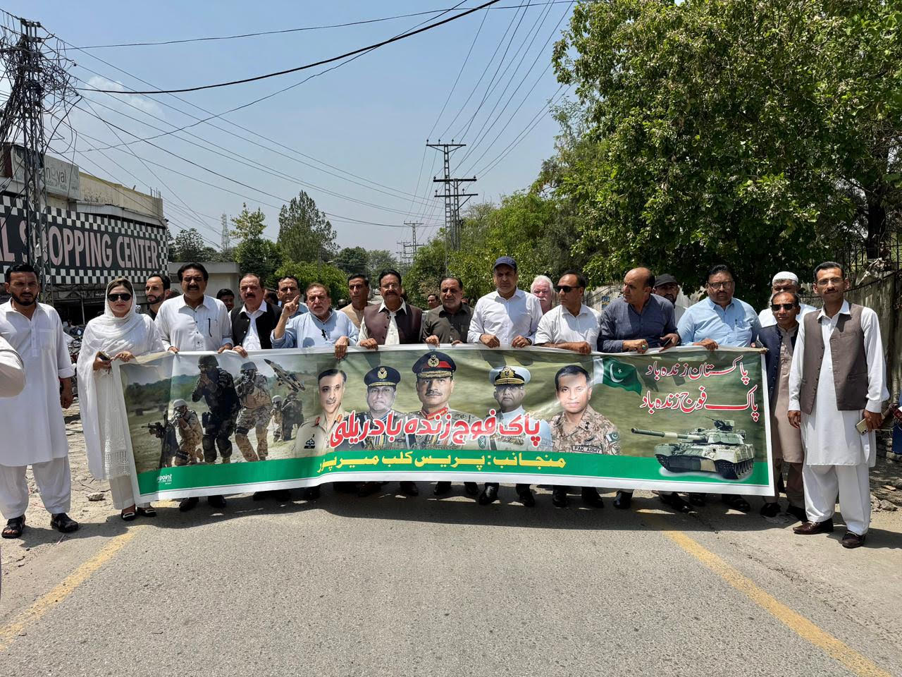 According to the details, a grand rally was organized in favor of the Pakistan Army, which started from the Press Club and passed through Mian Muhammad Road, Press Club Road and culminated again at the Press Club under the leadership of the Kashmir Press Club President Syed Abid Hussain Shah, Secretary General Sohrab Ahmed Khan, ex KPC Presidents and Sr. journalists Altaf Hamid Rao, Arshad Butt, Sajaad Jiraal, Zaffar Mughal, vice President zRana Shabir Rajourvi, Shehzada Iqbal besides Chairman District Council Raja Naveed Akhtar Goga, Mayor Municipal Corporation Chaudhry Usman Ali Khalid, Deputy Mayor Muhammad Ramzan Chughtai, President District Bar Association Chaudhry Mahmood Hussain Plakvi Advocate, President High Court Bar Waseem Younis Advocate, former Director General Information Raja Azhar Iqbal, Major (Retd) Khizr-ur-Rehman of PML-N, General Secretary of Bar Chaudhry Fayyaz Advocate, Joint Secretary Mian Adnan Saeed Advocate, Vice President Chaudhry Gulbahar Advocate, Senior Journalist Shaukat Ali Naz, Municipal Councilors Chaudhry Mahmood, Raja Imran Munir, Ansar Bashir Tas, Councilor Hamid Rauf Advocate, President PMA Dr. Ijaz Ahmed Raja, President Dental Council Azad Jammu Kashmir Dr. Adnan Marghoob, Information Officer Muhammad Javed Malik, President All Azad Kashmir Private Schools Association Mirza Wajahat Baig, leaders of employee organizations Masood Rathore, Qaiser Shiraz Kazmi, Qaiser Masood Butt, Chaudhry Shakeel (Education), Former President Chamber of Commerce and Industries Faisal Manzoor, Senior Lawyer Sidra Latif Advocate, Asma Advocate, Mir Khalil, Mirza Shabbir Kanwal Jaral, Raja Sohrab Khan, Rana Shabbir Rajouri, Arshad Mehmood Butt, Shahzada Iqbal, Altaf Hameed Rao, Zafar Mughal, Former President Sajjad Jaral, Former Secretary Sajjad Bukhari, Sajjad Khanpuri, Zahoor Rashid, Khurram Usman, Raja Irfan, Imran Chaudhry, Zafar Khatana, Aamir Malik, Faisal Gulzar, Adnan Jabbar Mughal, Shiraz Bukhari, Arshad Gilani, Zameer Chohan, Muhammad Azam, Raja Babar, Naeem Baloch, President Anjuman Tajran Asif Dar, Raja Khalil Yousaf, Member District Council Chaudhry Mukhtar, Tax Inspector Raja Kamran, Raja Waseem, Shakeel Tas, Engineer Rohan Chaudhry, Raja Shafaqat, besides large of lawyers, political leaders and activists government and private sector employees and large number of the general public.